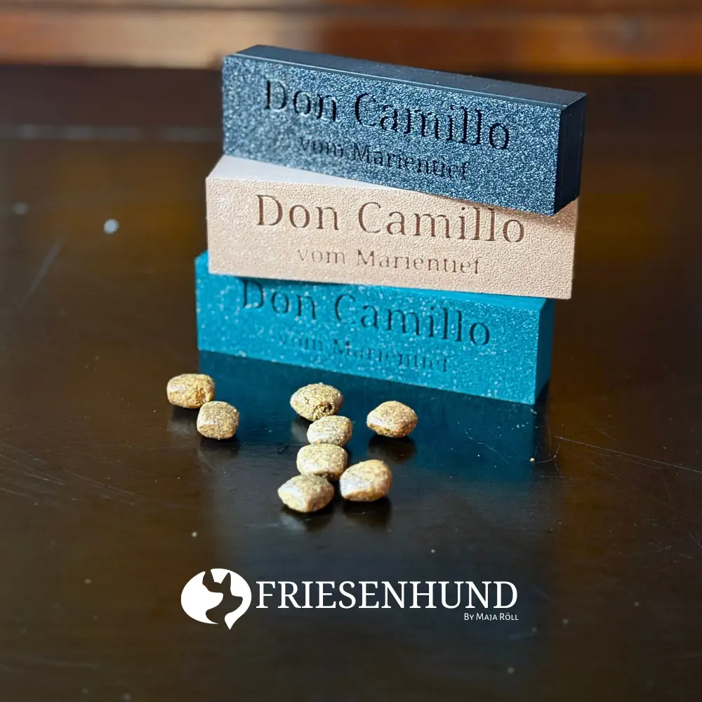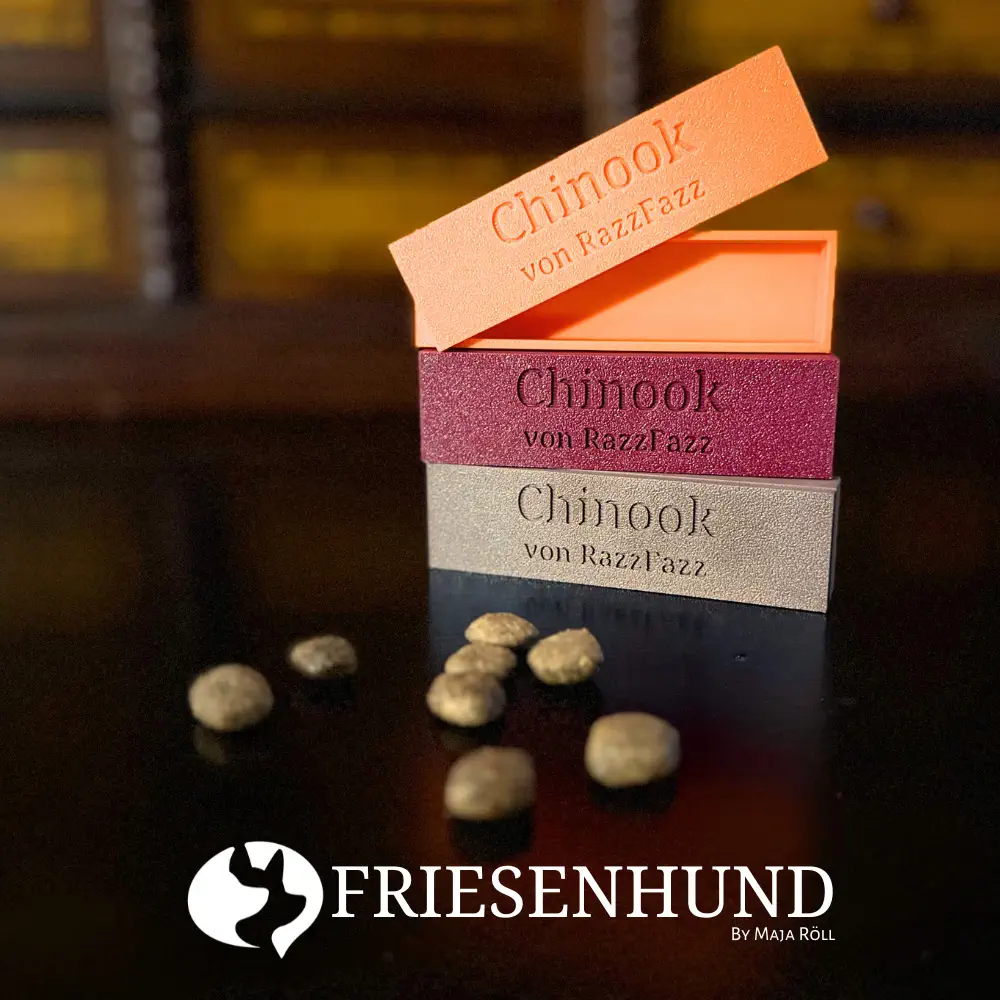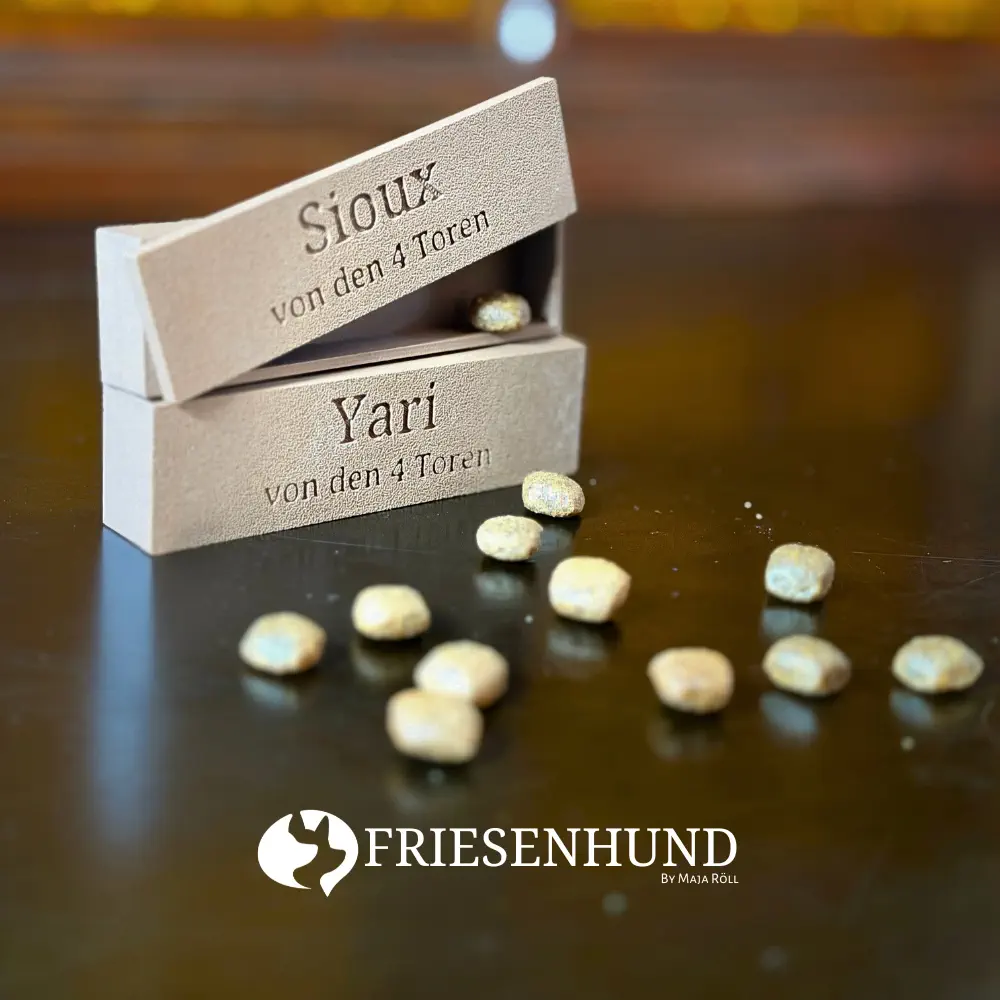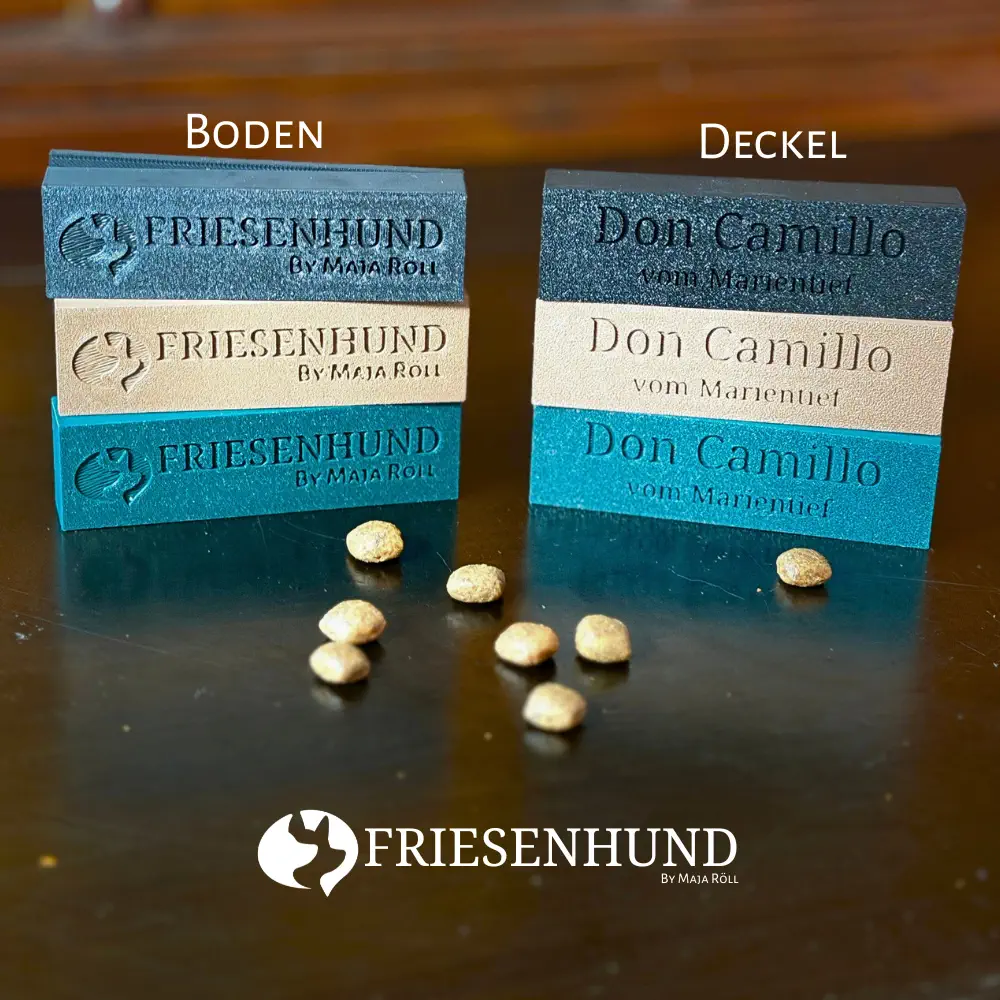 Dein befüllbarer Fährtengegenstand aus Kunststoff mit Personalisierung bekommt den Namen deines Hundes auf den Deckel, so wie du ihn zusammen mit der Farbe im Kommentarfeld auf der Kassenseite einträgst. Dafür wird bei deiner ersten Bestellung einmalig eine neue Friesenhund Namensdatei erstellt.