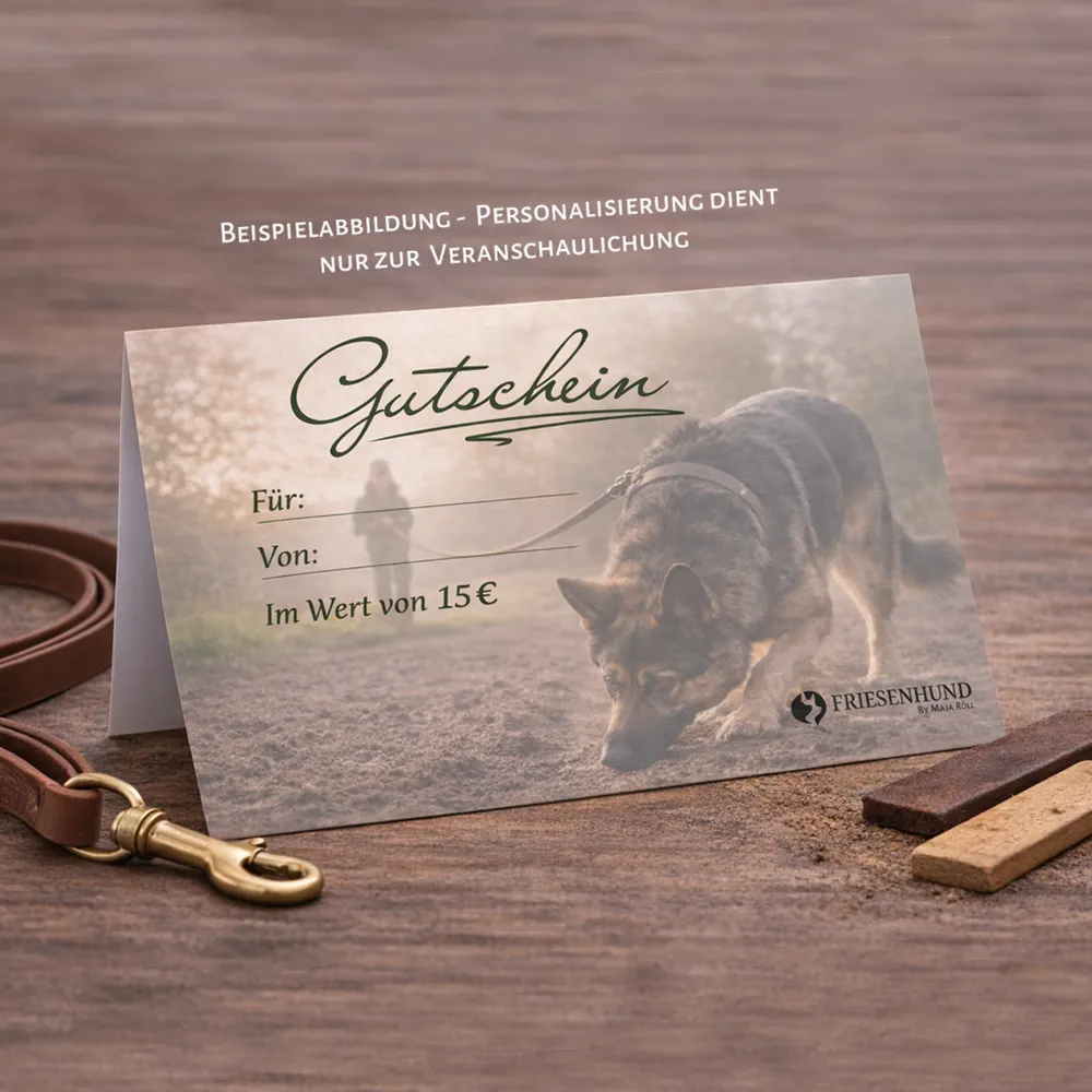 Hinter dem Gutschein steckt handgefertigtes, maßgeschneidertes und praxiserprobtes Hundesportzubehör aus der kleinen Manufaktur Friesenhund by Maja Röll in Norddeutschland. Wer ihn einlöst, kann noch individuelle und wichtige Details selbst festlegen: das bevorzugte Leinenende für das eigene Handling, eine fehlende Sonderlänge, bestimmte Beschläge oder eine ganz persönliche Farbkombination, um eine Leine oder ein Geschirr passend zu Hund und Mensch zu gestalten. Kein Serienprodukt von der Stange, sondern Fährtenzubehör, das einzeln auf der Werkbank entsteht – für das Mensch-Hund-Team, dem du eine Freude machen möchtest.