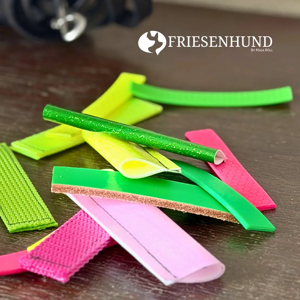 Dieses Gegenstand Set ist für dein Fährtentraining gedacht und nicht für andere Zwecke. Die Neonfarben heben sich deutlich vom Untergrund ab, und genau diese Sichtbarkeit ist hier Teil der Aufgabe.
