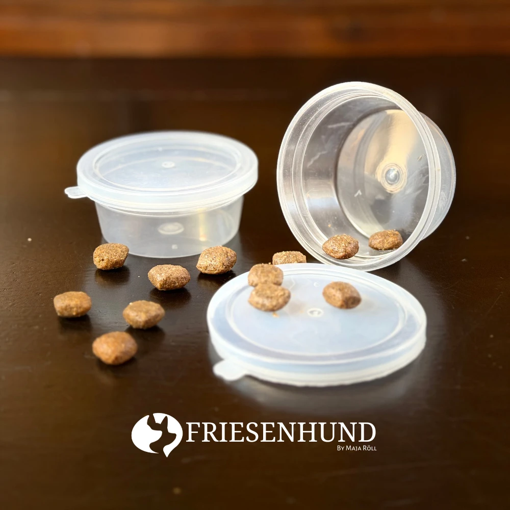 Die Döschen bestehen aus ungiftigem PP Material, das mit Lebensmitteln in Berührung kommen darf. Du kannst sie also problemlos für Futter nutzen.